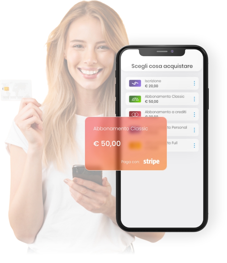 Fai in modo che le file al desk e i tempi di attesa diventino solo un ricordo! Attivare il sistema di pagamenti online è semplice e veloce, e permetterà ai tuoi clienti di acquistare in autonomia il proprio abbonamento e l’iscrizione direttamente tramite l’app, facilitare gli acquisti dei drop-in e dilazionare i pagamenti. Per fornire un servizio economico e sicuro ci siamo affidati a Stripe®, azienda leader nella gestione dei pagamenti online. Non c’è un canone fisso e le commissioni vengono applicate alle singole transazioni (1,1% + canone Stripe + IVA).